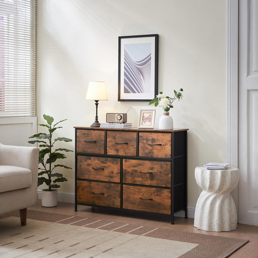 SKY-TOUCH Storage Cabinet : Bedroom Dresser with 7 Drawers Wide Storage Chest with Removable Fabric Bins Storage Organizer Unit for Living Room Entryway Hallway Nursery Kids Room (100*30*74CM Brown)