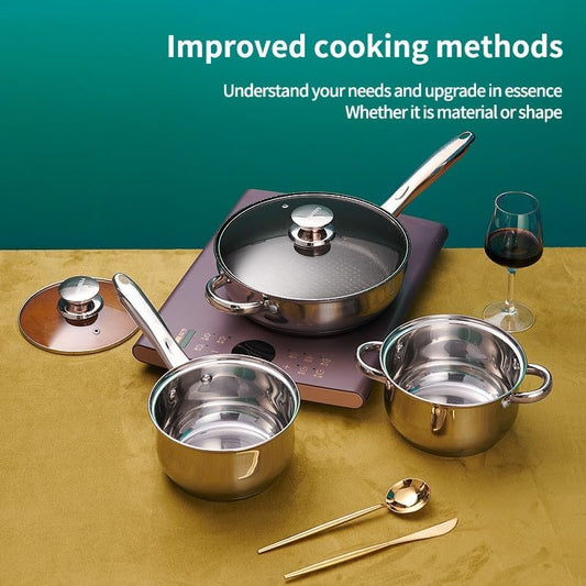 SKY-TOUCH 12PCS Stainless Steel Cookware Set : Thickened Multi-Layer Heavy Pots & Pans Setve with Tempered Glass Lids Fast Heating & Easy to Clean Kitchen Essentials for Cooking (Golden Brown)