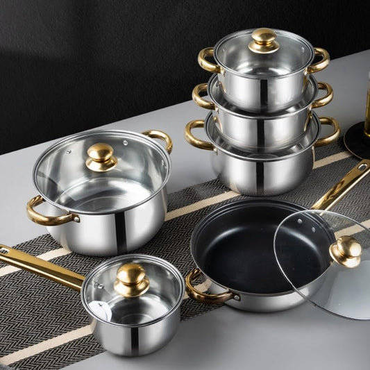 SKY-TOUCH 12PCS Stainless Steel Cookware Set : Heavy Pots & Pans Setve with Tempered Glass Lids Kitchen Essentials for Cooking (Gold)