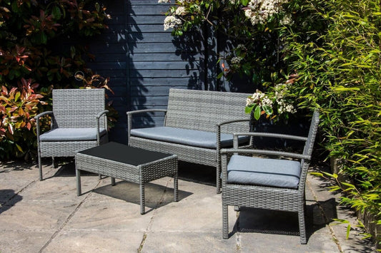 SKY-TOUCH Outdoor Furniture Set of 4 : 4 Seater Plastic Rattan Metal Frame Patio Sofa with Soft Cushion Black Tempered Glass Coffee Table for Garden Backyard Patio Balcony Gray