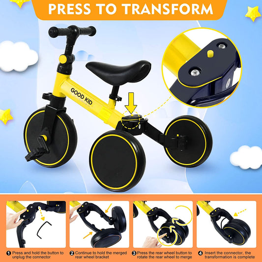 SKY-TOUCH 4 in 1 Kids Balance Bike Kids Tricycles for 1-4 Years, Toddlers Trike with Adjustable Seat Indoor Outdoor, Boys Girls Kids First Birthday Gifts Yellow